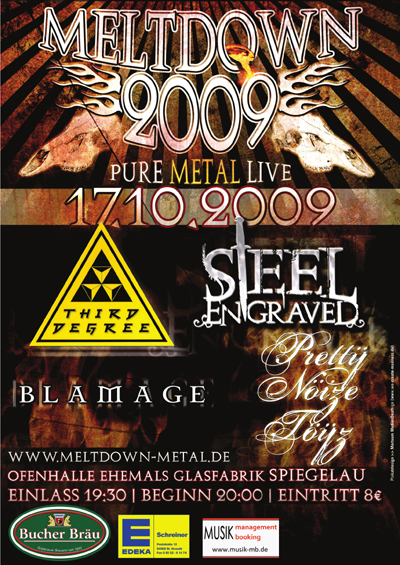 17.10.2009 Meltdown Metal Meeting 09 @ Glasfabrik (Spiegelau)Seite 1/2 :: 36 Bilder :: 2059 Klicks :: 0 Kommentare Meltdown Metal Meeting 09 mit den Bands: - Blamage - Pretty Nöize Töyz - Steel Engraved - Third Degree |