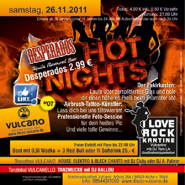EventDesperados HOT NIGHTSSa, 26.11.2011 Arbing 26 a D - 94529 Aicha v. Wald Discothek Vulcano Location