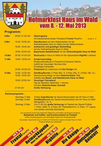 Event43. Hofmarkfest Haus i. WaldMi, 08.05.2013 - So, 12.05.2013 D - 94481 Grafenau Sportplatz Haus i. Wald