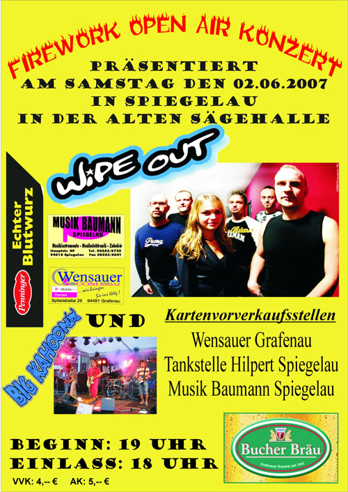 02.06.2007 Firework Openair mit Wipe Out (Spiegelau)Seite 1/12 :: 379 Bilder :: 9361 Klicks :: 0 Kommentare |