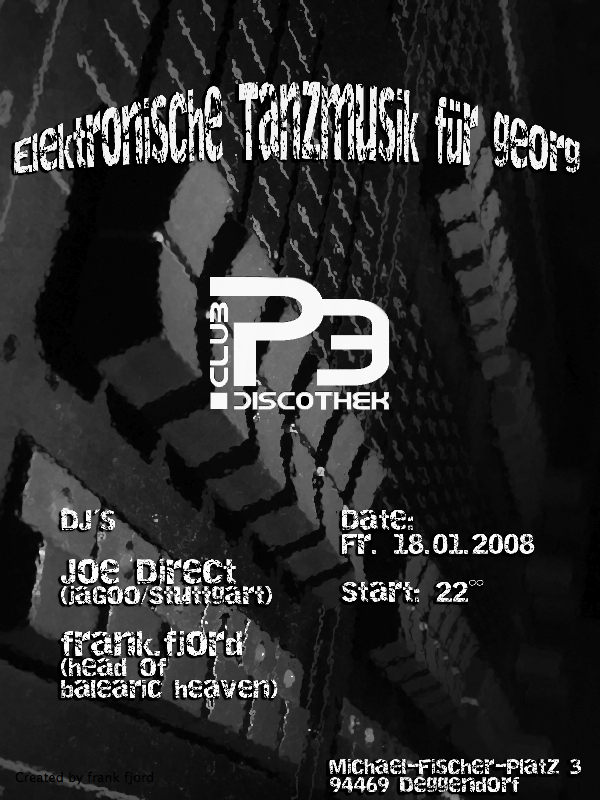 EventElektronische Tanzmusik für Georg @ P3Fr, 18.01.2008 Michael Fischer Platz 3 D - 94469 Discothek P3