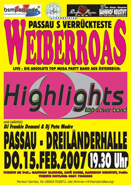 | Total verrückte Weiberroas in der Dreiländerhalle Die mittlerweile traditionelle Passaus verrückteste Weiberroas in der Dreiländerhalle wird wie jedes Jahr präsentiert von Passaus Szene-Gastronomie, “Bahnhof Neustift“, Cafe „Roses“, sowie Gasthof 3 Linden, mit den Partyexperten Mario Künzel und Walter Habenberger. Termin ist Donnerstag der 15. Februar 2007. Wie jedes Jahr, so soll auch heuer wieder die Dreiländerhalle „Kopf stehen“ und das ist sicher nicht zu viel versprochen. Dafür sorgt diesmal schon alleine die extra dafür engagierte „non-plus-ultra“ Stimmungs- und Partyband „Highlights “ aus Österreich, die bereits regelmäßig beim Pyrawanger Sommerfest Festzelt und Partyvolk zum kochen bringt. Außerdem gibt’s den unverwechselbar legendären „Bahnhof Neustift“ Party-Sound von den DJ s Puta Madre und Lolita Lametta“, die Luden-Kult-Band „Strassingers Finest“, mit Bandleader und Countertenor Günther Loibl, eine wirklich gigantische Lichtshow, spitzenmäßige Bühnenshoweinlagen, eine Reise zu gewinnen und und und... Also, auf geht`s „närrische Weiber und Männer“, nichts wie hin zum diesjährigen Passauer Faschingshöhepunkt für jung und alt! Einlass ab 19.30 Uhr. VVK 8.50€, Gasthof 3 Linden, Steinweg; Cafe Roses, Grabengasse; Bahnhof Neustift, PAWO; INFO- und Ticket-Hotline sowie Tischreservierungen: Tel: 0851-7568383 |