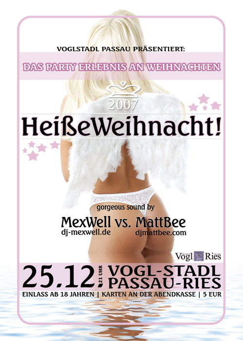 Nach dem großen Erfolg 2006 präsentiert VoglStadl Passau: Das PartyErlebnis an Weihnachten 2007 "Heiße Weihnacht!" heiß - sündig - leidenschaftlich - exzessiv Der bereits durch die kultige Veranstaltungsreihe Lust auf's eX! überregional bestens bekannte VoglStadl öffnet dem Passauer Partyvolk auch heuer wieder am 1. Weihnachtsfeiertag seine Pforten. Die von den Machern von Lust auf's eX! organisierte Veranstaltung wird zum Weihnachtsfest natürlich in gewohnter Manier sündig, exzessiv und dabei doch niveauvoll gefeiert. Mit dieser Veranstaltung gibt es nun endlich eine echte Alternative für alle anspruchsvolleren Menschen (ab 18 Jahren) in und um Passau, die es satt haben, jedes Jahr auf zweitklassigen Veranstaltungen "weihnachtliches Industrieflair" erleben zu müssen, um schließlich auf Bierbänken bei Getränken aus Plastikbechern in alten Schulballerinnerungen zu schwelgen. Für die heißen Beats sorgen Passaus angesagteste Turntablerocker MexWell (dj-mexwell.de) und MattBee (Pure Soda - djmattbee.com) und zur nötigen Abkühlung gibts natürlich auch an Weihnachten kühles eX! und TouchDown satt. Desweiteren erwarten den Besucher wieder ein großes "Weihnachtspackerl - Gewinnspiel" unfassbar günstige Preise und viele weitere "Specials" die noch bekanntgegeben werden. - Wir wünschen schon jetzt eine "Heiße Weihnacht!'07" im VoglStadl Passau-Ries Line up: MEXWELL vs. MATTBEE Gewinnspiel Die Gewinner lauten: Vronaal Mitsch mich1980 CaRiNa DeLaMia sweet_kiss Chef1 Magge82 kleine-lady85 Babsi!! Die Gewinner melden sich, mit ihrem echten Namen, bei bsmUser "MattBee" und werden dann in der Gästeliste eingetragen. Ausweispflicht! Einlass ab 18 Jahren - unter Vorbehalt - Ausweispflicht |