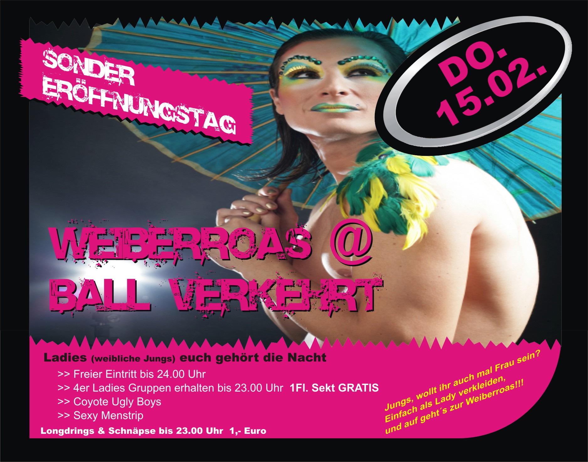 | Weiberroas @ Ball verkehrt Ladies (weibliche Jungs) euch gehört die Nacht! Wolltet Ihr Jungs auch mal Frau sein? Einfach als Lady verkleiden und auf gehts zur Weiberroas!!! - Freier Eintritt bis 24.00 Uhr - 4er Ladies Gruppen erhalten bis 23.00 Uhr 1 Fl. Sekt GRATIS - Coyote Ugly Boys - Sexy Menstrip Longdrinks & Schnäpse bis 23.00 Uhr - 1,- €uro. |