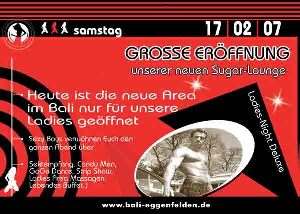 Charts, Partysound, Dance & Black präsentiert von DJ Ray Woods Sexy Boys verwöhnen alle Ladies den ganzen Abend über. Sektempfang, Candy Men, GoGo Dance, Strip Show, Ladies Area Massagen, Lebendes Buffet. |