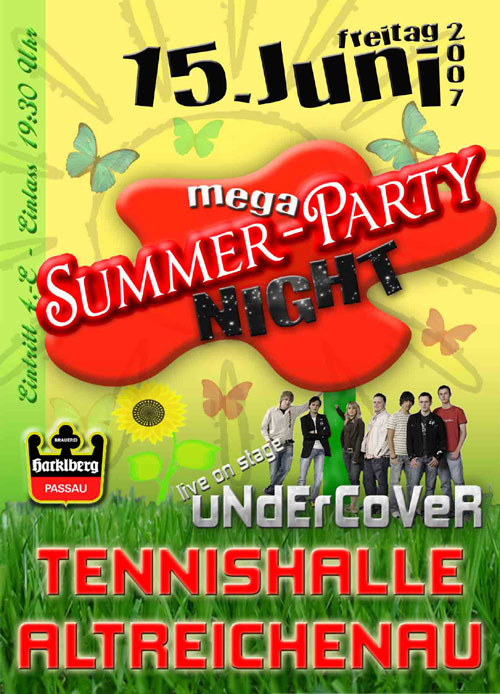 | Am 15. Juni findet in der Tennishalle Altreichenau die Summer Party Night statt Ein Mega Event der Extra Klasse mit der Rock- und Partycoverband uNdErCoVeR aus dem Raum Waldkirchen-Freyung Rockig & Partygeil - so ist auch diesmal das Motto Mit einer langen Schnapsbar, Pilsstand und Imbissmöglichkeiten ist auch in dieser Hinsicht für das leibliche Wohl bestens gesorgt! Das erste mal wird in Altreichenau eine solche Mega Party stattfinden Als Vorband tritt die Band Outlaw auf, die die Stimmung anheizen wird und den Jungs von uNdErCoVeR einen optimalen Vorlauf bieten Auf ein zahlreiches Erscheinen, viel Durst und Hunger sowie extremster Partylaune freut sich der SV Neureichenau und die Band uNdErCoVeR P.S. ORIGINAL Lobo-Schnitzelsemmel sind im Einsatz "An guadn" |