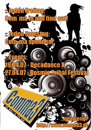 Das Wochenende im Comma3 Die Woche ist rum und es kann wieder kräftig gefeiert und getanzt werden. Im Comma3 seit ihr dafür genau richtig! Freitag, den 13.04.2007: Com´ma in and find out Open: 22:00 Uhr AK: 3 Euro Music: DJ Junior Samstag, den 14.04.2007: Com´ma spenden Open: 22:00 Uhr AK: 3 Euro Music: MATT BEE Bei dieser Aktion wird ein gewisser Prozentsatz des Umsatzes an eine Passauer Wohltätige Stelle gespendet! Also helft mit und geniesst dabei die Party Beachtet bitte auch unsere Sonderevents: 19.04. - Decadance X 27.04. - Cosmic Tribal Festival 28.04. - Coyote Girls |