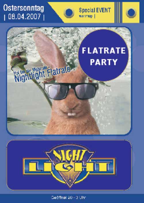 Wir heizen euch am Ostersonntag mal richtig ein Das gibts nur im Nightlight: Flatrate Party nur einmal Eintritt zahlen und dafür gibts dann alle offenen Drinks die ganze Nacht gratis an allen Theken Schnäpse, Weißbier, LONGDRINKS, Wasser, Cola, Spezi, Fanta und und und. Soviel ihr wollt. Miss Bunny Wahl Meldet euch beim DJ an, wählt euer Lieblinglied und anschließend müsst ihr gegeneinander an der GOGO-Stange tanzen Die oder Der Gewinner bekommt einen Spezail Preis Beginn 23.30 Uhr Und nicht zu vergessen jede Menge Animation und Spaß bis zum Abwinken Main Area Pharao: Best of House, Black, Charts, HipHop und und und mit mehreren DJ´s |