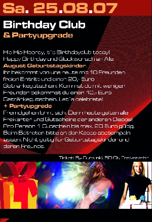 Am 25.August 2007 Birthday Club & Partyupgrade im Bali in Eggenfelden Hip Hip Hooray, it´s Birthdayclub today. Happy Birthday und Glückwunsch an alle August Geburtstagskinder. Ihr bekommt von uns heute mit 10 Freunden freien Eintritt und einen 20,- € Getränkegutschein. Kommst Du mit weniger Freunden, bekommst Du einen 10,- € Getränkegutschein. Let´s celebrate! Partyupgrade: Fremdgehen lohnt sich! Denn heute gelten alle Freikarten und Gutscheine der anderen Discos! Pro Person 1 Gutschein bis max. 20 Euro gültig. Beim Betreten bitte an der Kasse abstempeln lassen! Nicht gültig für Geburtstagskinder und deren Freunde. |