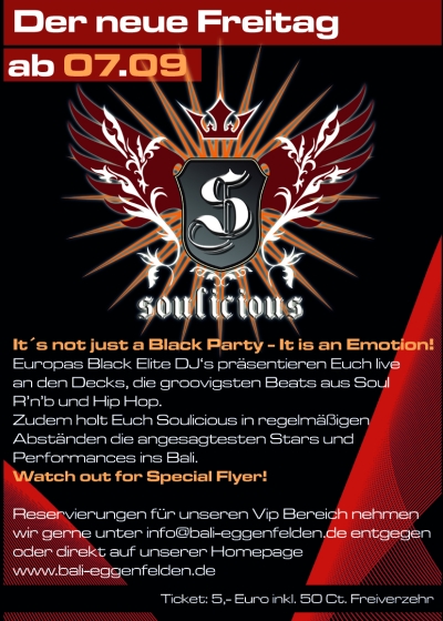 | Soulicious-Party am 12. Oktober im Bali in Eggenfelden It´s not just a Black Party - It is an Emotion! Europas Black Elite DJs präsentieren Euch live an den Decks, die groovigsten Beats aus Soul R´n´b und Hip Hop. Zu dem holt Euch Soulicious in regelmäßigen Abständen die angesagtesten Stars und Performances ins Bali: DJ Vantell (NYC) & MC Said |