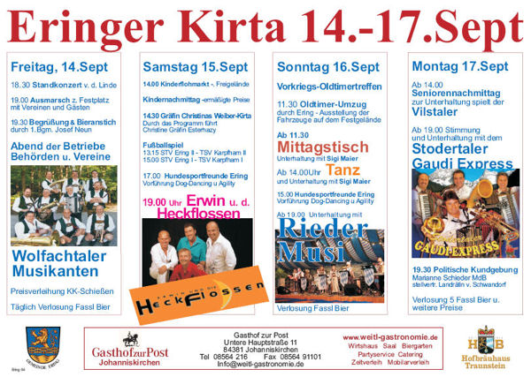 | Eringer Kirta von Freitag 14. bis Montag 17. September 2007 -> Im Bierzelt täglich: Verlosung von einem Fassl Bier!!! -> am Montag sogar 5 Fassl und weitere Preise!!! Freitag (14. September) 18.30 Uhr: Standkonzert an der Linde 19.00 Uhr: Auszug zum Festplatz mit Vereinen und Gästen 19.30 Uhr: Kirta Eröffnung durch 1. Bürgermeister Josef Neun Anschließend Abend der Betriebe, Behörden und Vereine mit: den "Wolfachtaler Musikanten" Siegerehrung der Kleinkaliber Gemeindemeisterschaft Samstag (15. September) 14.00 Uhr: Kinderflohmarkt auf dem Freigelände Kindernachmittag (ermäßigte Preise) 14.30 Uhr: "Gräfin Christines Weiber Kirta" Durch das Programm führt Christine Gräfin Esterhazy Fußball auf dem Eringer Sportplatz. 13.15 Uhr: STV Ering II gegen STV Karpfham II 15.00 Uhr: STV Ering I gegen STV Karpfham I 17.00 Uhr: Vorführung der "Inntaler Hundesportfreunde Ering" mit Dogdancing und Agility 19.00 Uhr: "Erwin und die Heckflossen" mit Partysound im Festzelt Sonntag (16.September) Vorkriegs-Oldtimertreffen 11.30 Uhr: Oldtimer Umzug durch Ering, - Ausstellung der Fahrzeuge auf dem Festgelände 11.30 Uhr: Mittagstisch mit Unterhalter Sigi Maier 14.00 Uhr: Tanz mit Unterhalter Sigi Maier 15.00 Uhr: Vorführung der "Inntaler Hundesportfreunde Ering" mit Dogdancing und Agility 19.00 Uhr: Unterhaltung mit der "Riederer Musi" Montag (17.September) 14.00 Uhr: Seniorennachmittag mit dem "Vilstaler" 19.00 Uhr: Stimmung und Unterhaltung mit dem "Stodertaler Gaudi Express" 19.30 Uhr: politische Kundgebung mit MdB Marianne Schieder (SPD stellv. Landrätin v. Schwandorf) |