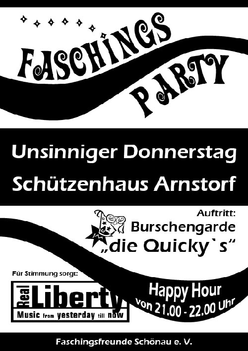 | Hallo Leute, es ist wieder so weit: Am unsinnigen Donnerstag, den 31. Januar 2008 ist nicht nur Weiberroas sondern Zeit für unsere riesen Faschingsparty im Schützenhaus in Arnstorf. Für mega Stimmung sorgt REAL LIBERTY, Music from Yesterday till now! Wir haben für Euch wieder zwei riesen Bars am Start an denen Ihr günstig was trinken und leckere Cocktails schlürfen könnt. Unsere Garde sowie die Burschengarde "The Quickys" werden euch in den Band-Pausen richtig einheitzen!!! |