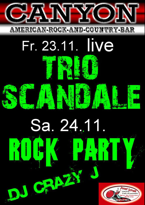 | CANYON AMERICAN BAR PRESENTS am Freitag 23.11.07 live on Stage das TRIO SCANDALE eine absolut aussergewöhnliche Besetzung- Franz Absmeier und Joe Zettinik von der Band Medley und Simone (Sängerin der Band Power Planet) werden ein absolut BUNT gemischtes Programm präsentieren, von dem man oft nicht glaubt, dass das zu dritt überhaupt möglich ist (man munkelt, dass sich noch ein Special Guest angemeldet hat!!! wer? LASST EUCH ÜBERRASCHEN!!!!! und am Samstag 24.11.07 wieder die bereits legendäre ROCK - PARTY mit DJ Crazy J ACHTUNG: Jacky Special alle Jacky Mix nur 2,50€ und wir verlängern das Salitos Special => Salitos weiterhin nur 2,50€ Beginn: an beiden Tagen um 20 Uhr Einlass: ab 18 Jahren SEE YOU IN AMERICA |