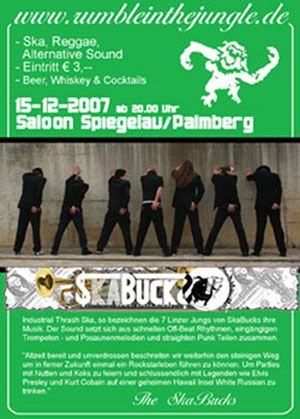 | Am 15. Dezember 2007 im Saloon Spiegelau/Palmberg Live Rumble mit Skabucks On Stage: THE SKABUCKS Industrial Thrash Ska, so bezeichnen die 7 Linzer Jungs von SkaBucks ihre Musik. Der Sound setzt sich aus schnellen Off-Beat Rhythmen, eingängigen Trompeten - und Posaunenmelodien und straighten Punk Teilen zusammen. “Allzeit bereit und unverdrossen beschreiten wir weiterhin den steinigen Weg um in ferner Zukunft einmal ein Rockstarleben führen zu können. Um Parties mit Nutten und Koks zu feiern und schlussendlich mit Legenden wie Elvis Presley und Kurt Cobain auf einer geheimen Hawaii Insel White Russian zu trinken.” - RuffGonG presents Reggae & Alternative Sound - Eintritt € 3,-- - Beer, Whiskey & Cocktails |