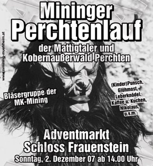 | Perchtenlauf 2007 auf Burg Frauenstein Auch dieses Jahr gibts wieder den traditionellen Perchtenlauf in Frauenstein. ab 14:00 Uhr traditioneller Adventmarkt ca. 17:00 Uhr Perchtenlauf direkt am Grenzübergang Ering/Inn |