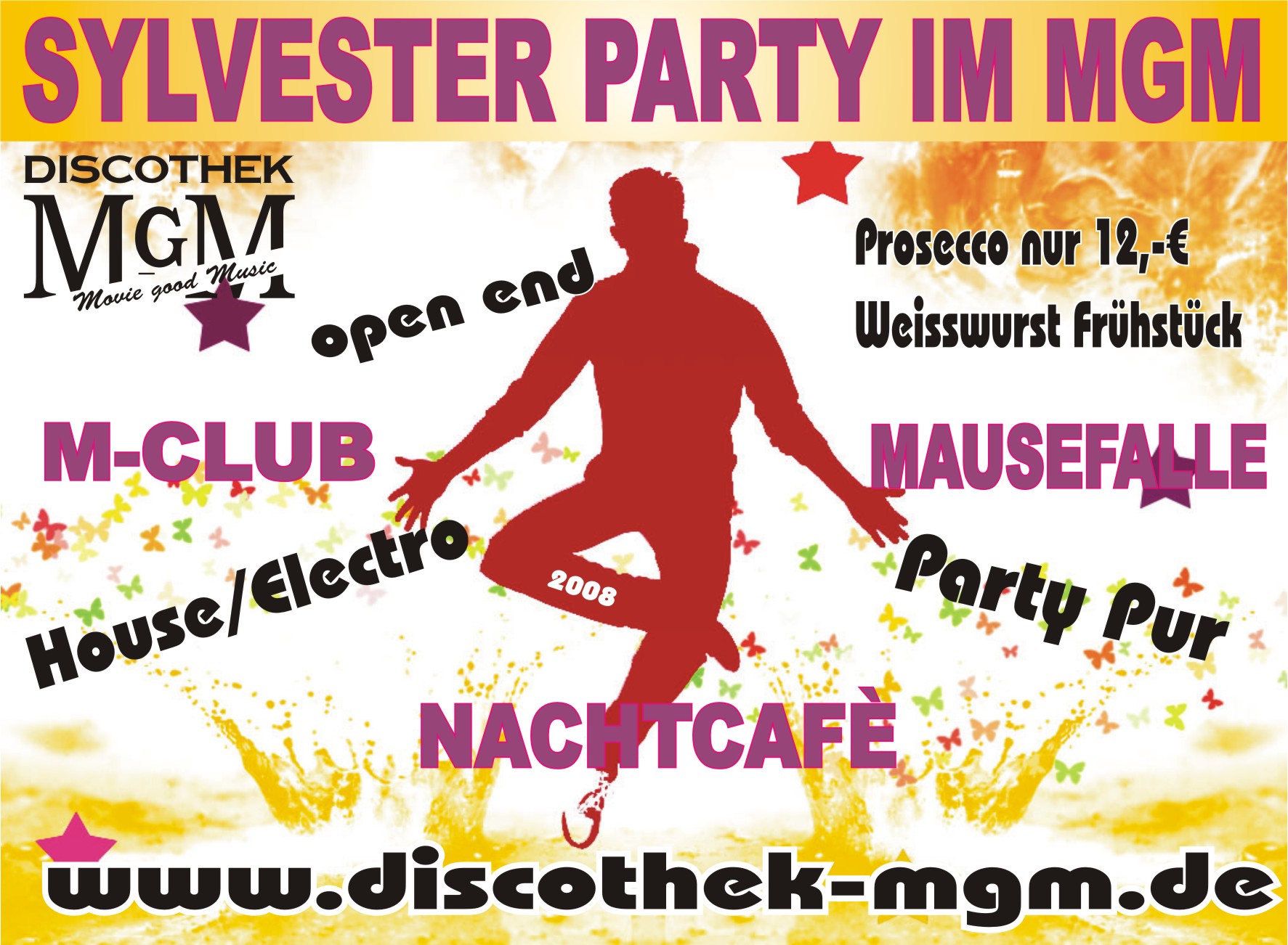 Am 31. Dezember 2007 im MGM in Plattling SYLVESTER PARTY Wir sagen Danke für das Jahr 2007. - Eintritt Frei von 21°° - 21³° Uhr dann 3,- €uro - Sekt Empfang von 21³° - 22³°Uhr - Jede Flasche Prosecco die ganze Nacht für 12,-€ - M-Club: House & Electro - Mausefalle: All hits and More - ab 3°° Uhr morgens Weisswurst mit Brezen - OPEN END............ 2008 Wir wünschen all unseren Gästen einen Guten Rutsch ins Neue Jahr 2008! Euer MGM Team |