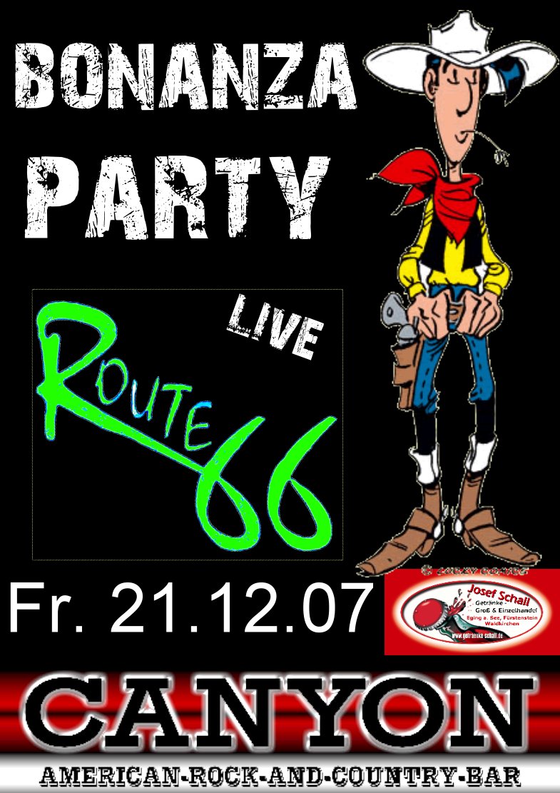 | CANYON AMERICAN BAR HAUZENBERG PRESENTS am Freitag 21.12.07 BONANZA PARTY in der Canyonbar Nun ja jeder kennt den Western Classicer Bonanza ! Den wollen wir wiederbeleben. D.h. wer mit Cowboyhut kommt (oder gleich im Westernoutfit) bekommt ein Pils gratis!!! (Es gelten natürlich auch die Salitoshüte) Für die absolut passende musikalische Umrahmung sorgen Route 66 die sich als Country-Rockband bereits in Pullman City und vor allem im ganzen Landkleis bereits eine top-Namen gemacht haben ! also es gilt Bonanza forever ! ACHTUNG: => Salitos weiterhin nur 2,50€ jedes 7. Salitos ist kostenlos! Beginn: um 20 Uhr Einlass: ab 18 Jahren wir freuen uns auf euch SEE YOU IN AMERICA |
