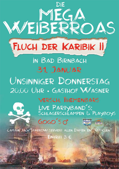 | Die MEGA Weiberroas FLUCH DER KARIBIK II Highlights bei der Weiberroas 2008 - der Wasner-Hofgarten wird zur Piratentaverne umgestaltet, dort sorgt die bekannte Liveband "Playboys" für Faschingsstimmung -im großen Wasner-Saal befinden sich mehrere Bars passend zum Thema dekoriert und für heiße Partystimmung sorgen keine Geringeren als die sensationellen Schlagerschlampen, übrigends erstmals in der Region - Special-Guests: Faschingsverein Bad Birnbach mit Auftritt der Hofdamen - Gaudianer aus Ruhstorf mit Auftritt der Prinzengarde - Männer Balett: Erotic sisters aus Bad Griesbach Captain Jack Sparrow persönlich wird allen Damen ein Rümchen servieren, und zur späteren Stunde die Hülllen fallen lassen. |