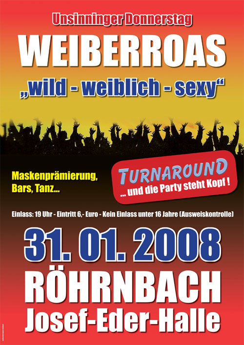 | Am 31. Januar 2008 in der Josef-Eder-Halle in Röhrnbach Weiberroas des Tennisclubs Röhrnbach -wild - weiblich - sexy- Für Megastimmung sorgt die Partyband Turnaround. Specials: Maskenprämierung Bars Tanz Kein Einlass unter 16 Jahren (Ausweiskontrolle) Einlass 19:00 Uhr |