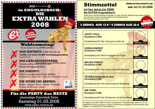 | Am 01. März 2008 im Studio 54 Ergoldsbach Extra Wahlen 2008 Wahlsamstag Heute könnt ihr im Extra wählen: - den Eintritt 5,00 € Eintritt oder 10,00 € und dafür 10,00 € Getränkegutschein - das Lieblingsgetränk dieses gibts dann noch in der Nacht zum Spezial-Preis - die Zukunft Wählt eure nächsten Party-Mottos Rockkantine - Pimp'n'Ho - Apress Ski - Sexplosiv - uvm. - die Musik des Abends Black / House / Rock / Party / Classics Ihr dürft alle Wünsche äußern! |