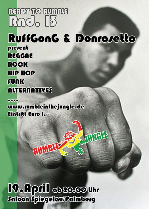 | RUMBLE IN THE JUNGLE am Samstag 19.04. ab 20.00 Uhr im SALOON Spiegelau/Palmberg Sound by RuffGonG & Donrosetto Reggae, Rock, Hip Hop, Funk, Alternatives, ..... Eintritt Euro 1,-- www.rumbleinthejungle.de |