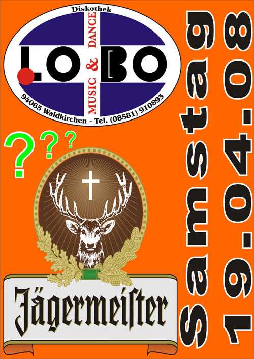 | Am 19. April 2008 im Lobo in Waldkirchen Jägermeister-Party Alle 3 Areas sind jeden Samstag für Euch geöffnet! Einmal Eintritt bezahlen und alle 3 Areas besuchen. Für Stimmung sorgt DJ Thommy. Lasst euch dieses Event nicht entgehen. |