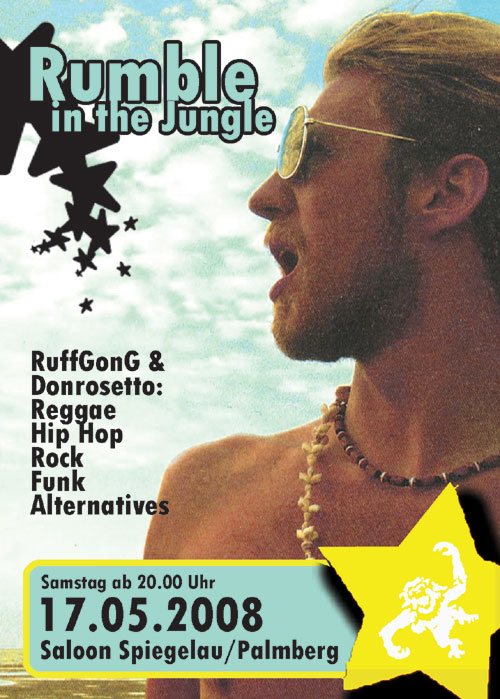 | Am 17.05.2008 Im Saloon Spiegelau/Palmberg Rumble in the Jungle ab 20.00 Uhr Reggae, Hip Hop, Rock, Funk, Alternatives by RuffGong & Donrosetto Eintritt Euro 1,-- www.rumbleinthejungle.de |