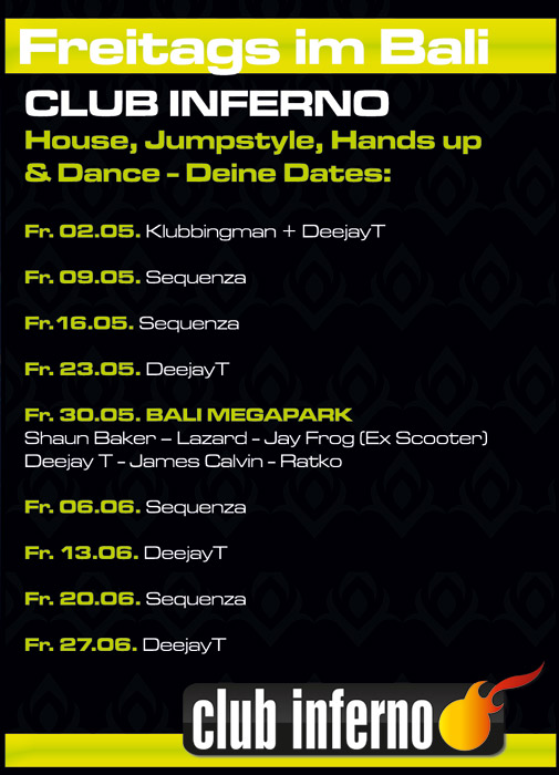 | Am 9. Mai 08 Im Bali Club Inferno @ Bali Das Beste aus Dance, Hands Up, House & Jumpstyle! Heute mit: DJ Sequenza Viel Spaß!! |
