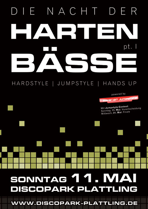 | Am 11. Mai 08 Im Discopark Plattling Die Nacht der harten Bässe Am Sonntag den 11. Mai geht sie wieder an den Start, Die Nacht der harten Bässe! Hier kommen alle Jumper, Hardstyler und Handz Up Freunde Voll auf Ihre Kosten, 6 Stunden vollgas durch die Nacht. Der mega Jumpstyle Contest im Mai! Powered by Bavarian Jumpstyle! Teil I am Pfingstsonntag 11.Mai, hier kann man sich unter kontakt@discopark-plattling.de anmelden. Die Endausscheidung findet am Mittwoch den 21. Mai in der Main Area des Discoparks statt. Für geile und harte Bässe sorgt kein geringer als Dee Jay Norrit! Infos auch unter www.bavarian-jumpstyle.de |