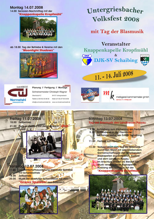 | Von 11. bis 14. Juli 08 Volksfest Untergriesbach Freitag 11.07. Zeltparty mit der Band Jive Samstag 12.07. Landwirtschafts-Ausstellung regionaler Betriebe Festbetrieb mit den Grazer Spatzen Sonntag 13.07. - Tag der Blasmusik 9.30h Gottesdienst mit Kirchenzug 13.30h großer Vorbeimarsch verschiedene Musik-Kapellen spielen im Zelt Ausklang mit der Knappen-Kapelle Montag 14.07. Senioren-Nachmittag mit der Knappen-Kapelle Abends Tag der Betriebe mit den Moonlight Shadows |
