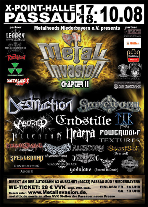| Am 17. + 18. Oktober '08 In Passau Metal Invasion Chapter II @X-Point-Halle Die Metal Invasion geht in die 2. Runde! Nach einem erfolgreichen ersten Jahr wird sich auch dieses Jahr der Himmel über Passau verdunkeln. Termin für diesen Event in der Passauer X-Point-Halle ist dieses Jahr das Wochenende vom 17./18.10.2008. Es wird euch auch dieses Jahr in der Halle wieder von einem Metalmarket über Foodstände bis hin zu einer Met-Bar alles geboten, was das Metalherz begehrt. Nationale und internationale Bands haben es sich zum Ziel genommen, die Dreiflüssestadt an diesem Wochenende erbeben zu lassen. Lasst euch also diesen Event nicht entgehen und sichert euch rechtzeitig euer Ticket unter www.metalinvasion.de Bisher bestätigte Bands: Destruction Graveworm Endstille Neaera Aborted Týr Alestorm Textures Svartsot Fleshcrawl Hollenthon Kromlek Seasons in Black Spellbound Sycronomica Developing Anger Scared to death Gwydion Godslave Dead Emotions See the evil come to town again... |