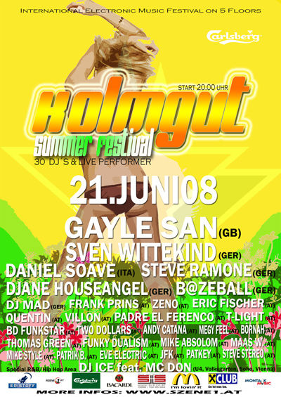 | Am 21. Juni 08 In Kolmgut (A) Kolmgut Summer Festival Special 5 Dancefloors - Intenational & National Top-Acts -Übertragung des EM Viertelfinales auf einer Videowall Livestyle Area - Fashion Corner - Fotoshooting - Hairstyle Corner - Bodypainting - Piercing & Tattoo - Foodstation Floors und Lineup: Floor 1: TECHNO » Gayle San(GB ) (Equator Rec./ http:// www.myspace.com/gaylesan /London) » Frank Prins(AT) (Abstract Booking FFM, http://www.myspace.com/frankprins ) » Quentin(AT) (www.we-love-music.com/Montauk Music, http://www.myspace.com/djquentin1) » BD Funkstar(AT) (EME-Booking/Skull Tunes) » Villon(AT) (www.soundoptic.at /Club Nova, http://www.myspace.com/djvillon ) » Mike Style(AT) (Montauk Music, http://www.myspace.com/djmikestyle ) » Patrik B.(AT) (Montauk Music, ) Floor 2: HOUSE/DISCO » STEVERAMONE (GER) (Amnesia World Tour 2008/http://www.myspace.com/steveramone ) » DJANE HOUSEANGEL (GER) (Etage 1, Saarbrücken, http://www.myspace.com/djanehouseange) » TWO DOLLARS (AT) (Corazound/Arena Wels/AT, http://www.myspace.com/twodollarsteam) » ANDY CATANA (AT) (http:// www.myspace.com/andycatana /Arena Wels) » FUNKY DUALISM (AT) (Pressure/Arena Wels, http://www.myspace.com/funkydualism ) » JFK (AT) (ARC Rec./Montauk Music, ) » MIKE ABSOLOM (AT) (Club Pachanga, http://www.myspace.com/mikeabsolom) Floor 3: MINIMAL/ELECTRO/TECHHOUSE » DANIEL SOAVE (ITA) (http:// www.we-love-music.com / Nature One, U60311, Mailand) » ERIC FISCHER (AT) (http://www.myspace.com/ericfischer / Club Nova) » Zeno (http:// www.pressure.at / Club Nova, http://www.mypace.com/zenoaustria) » PADRE EL FERENCO (AT) (EME-Booking/Rave on Snow, http://www.myspace.com/padreelferenco) » T-LIGHT (AT) (Giants Music, ) » EVE ELECTRIC (AT) (Montauk Music, http://www.myspace.com/claudiapetereder) » MAAS W. (AT) (Montauk Music, http://www.myspace.com/maas84) Floor 4: HARDTECHNO » SVEN WITTEKIND (GER) (Inflicted Rec./Knedeep Rec./Abstract Booking) (http://www.svenwittekind.com) » B@ZEBALL (GER) (Artillery Booking, U60311, Frankfurt) » DJ MAD (GER) (Underground Solution, Kaiserslautern) » MEGY FEEL (AT) (Hardgroovs/Combat Skill, http://www.myspace.com/megyfeel) » THOMAS GREEN vs. BÖRNAH (AT) (Centerfire Rec./Nightmare Dj-Team, http://www.myspace.com/djthomasgreen) » PATKEY (AT) (Hardgroovs) » STEVE STEREO (AT) (Hardgroovs) Floor 5: RnB/HIP HOP/FUNK » DJ ICE feat. MC DON (AT) (Volksgarten, U4, Club Soho, Vienna, http://www.myspace.com/dj_icefire ) DAS Lineup sollte eigentlich für sich sprechen! |
