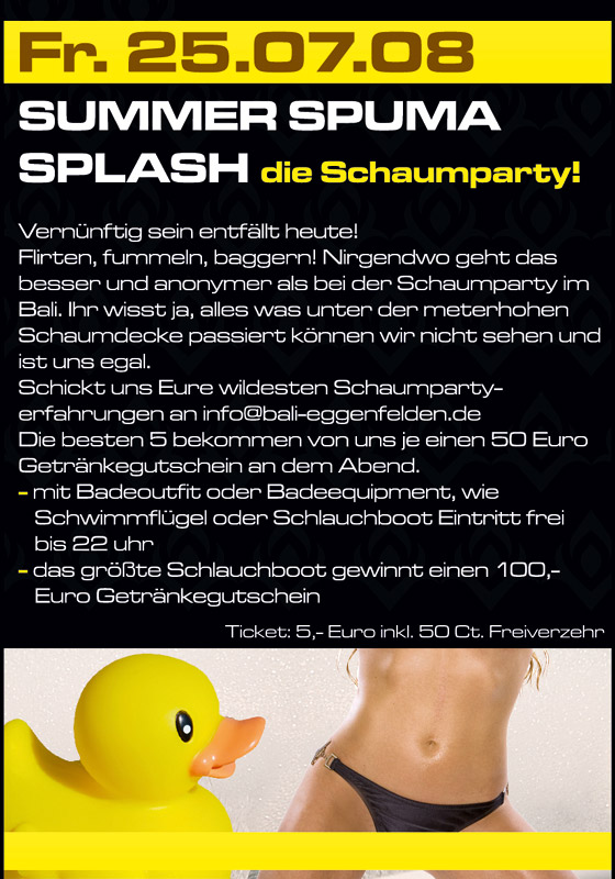 | Am 25. Juli 08 Im Bali Eggenfelden Summer Spuma Splash - Die Schaumparty! Verbünftig sein entfällt heute! Flirten, Fummeln, Baggern! Nigendwo geht das besser und anonymer als bei der Schaumparty im Bali. Ihr wisst ja, alles was unter der meterhohen Schaumparty passiert, können wir nicht sehen und ist uns egal. Schickt uns Eure wildesten Schaumpartyerfahrungen an info@bali-eggenfelden.de! Die besten 5 bekommen von uns je einen 50,- € Getränkegutschein an dem Abend. - mit Badeoutfit oder Badequipment, wie Schwimmflügel oder Schlauchboot ist der Eintritt frei bis 22 Uhr. - das größte Schlauchboot gewinnt einen 100,- € Getränkegutschein. |
