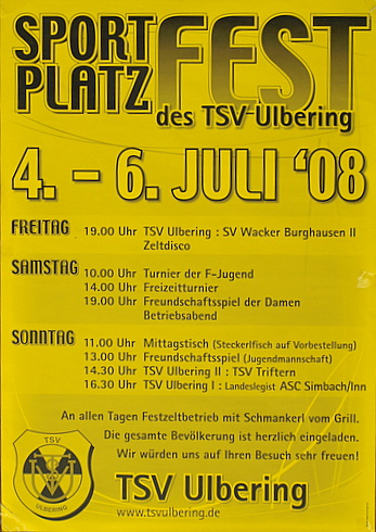 Zeltdisco Ulbering des TSV Ulbering am Ulberinger Freibad Festzeltbetrieb mit Schmakerl vom Grill um 19:00 Uhr: Fussballspiel TSV Ulbering : SV Wacker Burghausen II ab 21:00 Uhr: Zeltdisco mit DJ die gesamte Bevölkerung ist herzlich eingeladen |