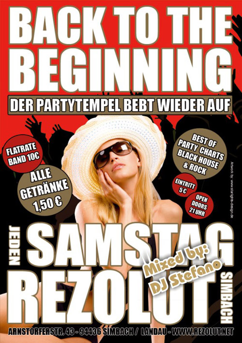 | Am 2. August 08 In Simbach BAck to the Beginning @ Rezolut Öffnungszeit ab 21.00Uhr - 5.00 Uhr Eintritt 5.-€uro, normale Getränkepreise oder 10.-€uro für das Flatrate Band und jedes Getränk für 1,50€uro natürlich nur Originale, auch Red Bull, Cocktails u.v.m. Musik: House - Elektro - Black - Dance - Rock - Oldies - PARTY Best Music Mix by DJ Stefano Auf Euer Kommen freut sich das Rezolut TEAM!! |