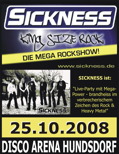 | Am 25. Oktober 08 In Thyrnau SICKNESS - in der Arena Hundsdorf SICKNESS bedeutet "Live-Party mit Mega-Power - brandheiss im verbrecherischen Zeichen des Rock & Heavy Metal" Unter diesem Motto sorgt die Topband SICKNESS aus dem Raum Mittelfranken auf ihren Konzerten garantiert für begeisterte Fans! Hinter der Coverrockband SICKNESS und ihrem Konzept stecken Leute, die in der Musik-Szene keine Unbekannten sind. Andi ist vielen noch von „SPIDER“ ein Begriff. Nudge hat mit „ROCKZONE“ und Chris mit „short lived passion“ bereits viele Bühnen auch außerhalb Bayerns gerockt. Tom (lead-vocals), Andi (lead-vocals), Chris (keyboards, lead-vocals), Nudge (gitarre, vocals), Marcus (bass, vocals), Udo (gitarre) und Tom (drums) geben einfach alles, um dem Publikum mit schweißtreibenden Songs und so mancher Überraschung eine Party-Rock-Show zu bieten, die süchtig macht. Seit 2003 stehen alle sieben Musiker in dieser Besetzung gemeinsam auf der Bühne und können auf verschiedene Highlights zurückschauen, wie z.B. gemeinsame Auftritte mit den deutschen Rock-Legenden „BONFIRE“, „DORO“ und „AXXIS“. Vielseitig ist die Band auch in Bezug auf ihr Programm: AC/DC - Billy Talent - Bloodhound Gang - Blink 182 - Bon Jovi - Böhse Onkelz – Boss Hoss - Die Ärzte - Die Toten Hosen – Disturbed - Farin Urlaub - Guns´n Roses - Hammerfall - Hot Action Cop - Iced Earth – In Extremo - Iron Maiden - Joachim Deutschland - Kid Rock - Klaus Lage - Liquido – Manowar - Metallica - Nena - Nirvana - Offspring - Papa Roach - Queen - Rage against the machine - Robbie Williams – Rammstein - Sportfreunde Stiller - Status Quo - Subway to sally - System of a down - Van Halen u.v.m. + Ein abwechslungsreiches Programm, das für jede/n etwas bietet und jedem Zuhörer Feuer im Hintern macht - Wer hier nicht mitfeiert ist UNROCKBAR! + Eine abwechslungsreiche Show mit so mancher Überraschung! + Eine abgestimmte Sound- und Lichtanlage und auch so mancher feuriger Effekt! Als 7-köpfige Gang erobert die Top-Band SICKNESS immer mehr Herzen in Franken und weit darüber hinaus! SICKNESS LOVE´S TO ROCK YOU |