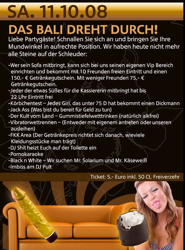 | Am 11. Oktober 08 In Eggenfelden Das Bali dreht durch! Liebe Partygäste! Schnallen Sie sich an und bringen Sie Ihre Mundwinkel in aufrechte Position. Wir haben heute nicht mehr alle Steine auf der Schleuder: - Wer sein Sofa mitbringt, kann sich bei uns seinen eigenen Vip-Bereich einrichten und bekommt mit 10 Feunden freien Eintritt und einen 150,- € Getränkegutschein. Mit weniger Freunden 75,- € Getränkegutschein. - Jeder der etwas Süßes für die Kassierein mitbringt hat bis 22 Uhr Eintritt frei. - Körbchentest: Jedes Girl, das unter 75 D hat bekommt einen Dickmann - Jack Ass (Was bist Du bereit für Geld zu tun) - Der Kult vom Land: Gummistiefel wetttrinken (natürlich alkfrei) - Vibratorwettrennen - Fkk Area - DJ Shit heizt Euch auf der Toilette ein - Pornokaraoke - Black n White - Wir suchen Mr. Solarium und Mr. Käseweiß - Imbiss am DJ Pult Viel Spaß bei diesem Event!! |