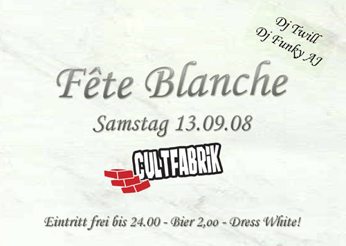 | Am 13. Septemer 08 In Passau Fete-Blanche @ Cultfabrik Die Houseparty in Weiss!! Dj Funky AJ und Dj Twill und Special Guest heizen richitg ein! Jeder Gast der in Weiss kommt, Eintritt frei! Ansonsten Eintritt 3,00 Euro Beginn: 22:00 Uhr House-Electronic-minimal Techno Viel Spaß!! |