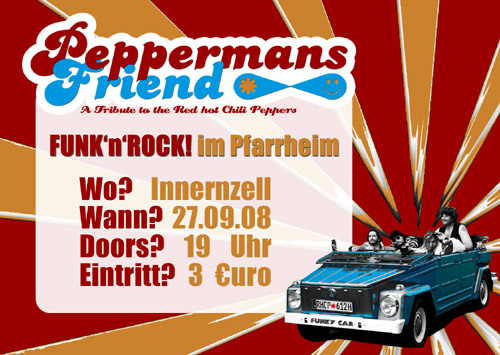 | Am 27. September 08 In Pfarrstadl Innernzell Chili Peper Projekt im Pfarrstadl Die Neue Rockformation: Peppermans Friend Chili Pepper on Weisbier stellt ihr Chili Pepperprogramm vor. Die Band: Julian \"Scheichi\" Scheuchenzuber - Gitarre Sigi \"Sams\" Weikl - Drums Christian \"Mode\" Muhr - Voice (Angel) Christian \"Balboo\" Bojko - Bass Hörprobe: http://www.myspace.com/peppermansfriend Zum essen gibt´s natürlich Chili!! Getränke: Weissbier Und natürlich auch andere Getränke im Barzelt. Also unbedingt hingehen!! |