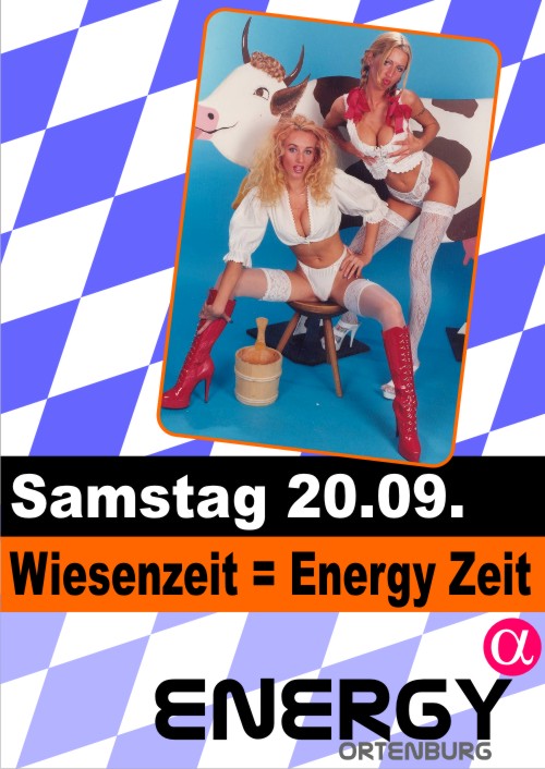 | Am 20. September 08 In Ortenburg Alpha Energy / Wiesenzeit = Energy Zeit A jeder Bursch oda fesches Madl wos mit da Lederwix oda Dirndl kimmt hod a Maß Bier oda a Radler beim Eintritt frei! Natürlich kannst super Wies`n Energy Preise gewinnen!!! Jede Maß Bier oder Radlermaß die ganze Nacht nur 4,49 € Ab 02:00 Uhr Weißwurst Frühstück (1 Paar Weißwürste & Weizen) für 4,99 € in unserem Bistro Sexy Wiesen`n Hasen werden Euch mit 100 GRATIS Bayern Filzhüten belohnt Außerdem - Rodeo Bullriding - Maßkrug stemmen - Wettnageln - Wettjodeln Doppeldecker von 21:00 - 02:00 Uhr auf alle Getränke mit dem Alpha Logo (Ausgenommen Fl. ab 0.35l) |