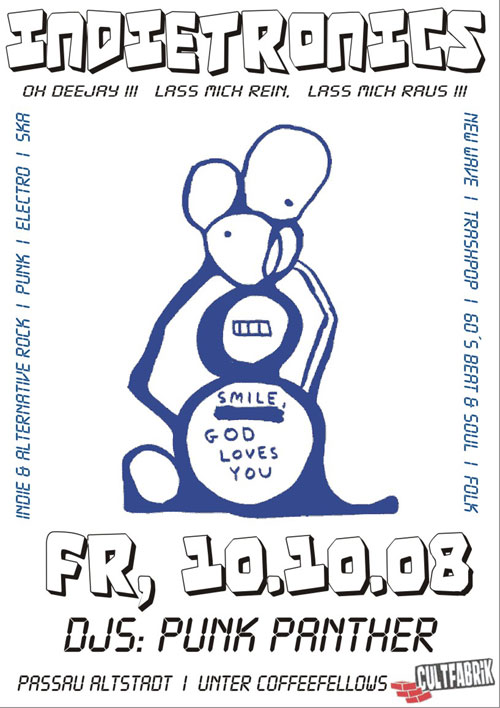 | 10. Oktober 2008 Cultfabrik in Passau Indietronics Start: 22.00 Uhr Dj: Punk Punther Indierock, Ska, Trash Pop Eintritt: 3 Euro bis 24 Uhr Bier für 1,00 Euro Highlight: Luftgitarrenkontest: 01.00 Uhr 1. Preis Flasche Wodka plus 6 Red Bull 2. Preis Flasche Prosecco 3. Preis Longdrink Die Cultfabrik: eine ganz neue Location in mitten der Passauer Altstadt. Abwechslungsreiche Veranstaltungsreihen: jeden Dienstag Nachtschicht endlich zu House, Dj Twill jeden Mittwoch Casino Royal Fete, 50% Chance alle Getränke umsonst zu bekommen, wird einfach mit dem Barkeeper ausgewürfelt, Eintritt frei Dj Nitro jeden Donnerstag Funky Beats (Volxstanzgruppe presents) alle 2 Wochen Freitag Indietronics und Groove Cultfabrik alle 2 Wochen Samstag Drum & Bass Party bis dann in der Cultfabrik |