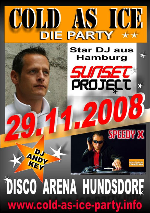 | Nach der ersten erfolgreichen und gelungen "COLD AS ICE PARTY" findet die nächste am 29. November 2008 statt. Die MEGAPARTY fndet diesmal in der Discothek Arena in Hundsdorf statt. LIVE ON STAGE: SUNSET PROJECT Der Star DJ aus Hamburg und Remixer of Bangbros, Franky B., Master Blaster uvm... Aktuelle Singe: NOBODY'S DIARY Remixe: Bangbros - Happy Hour Franky B. - A Horse With No Name Master Blaster - Everywhere C.C.C. - La Isla Bonita SPEEDY X Mit seinen aktuellsten Hits wie: - Dreamlover - Cold As Ice - No More - You Shook Me All Night Long - You're The One That I Want ACHTUNG.... GANZ HEIß: Das erste Project von SPEEDY X: "THE BAD BAYS PROJECT - SWEET HOME ALABAMA" ist am 29.11.2008 Live in der Disco Arena zu hören !!!! DJ ANDY KEY Samstag 29.11.2008 Discothek Arena Hundsdorf 17 94136 Thyrnau Germany, Bayern Info unter: www.cold-as-ice-party.info Gewinnspiel Tragt Euch in den Meetpoint ein und gewinnt eine von 5 VIP Karten, wo ihr Hautnah zu den Stars wie SUNSET PROJECT und SPEEDY X in den VIP Bereich könnt. Zusätlich gibt es noch für die VIP Gäste ein kostenloses Fotoshooting mit den Stars. Außerdem wird auch eine Karte verlost, die dem Gewinner die Möglichkeit bietet, mit SPEEDY X ein Wochenende auf Tour zu gehen ! Mitmachen und Gewinnen können nur die im Meetpoint stehen! Verlosung findet dann genau 3 Tage vor dem Event statt. Info zu SUNSET PROJECT: SUNSET PROJECT heisst das dynamische Projekt, welches in nächster Zeit noch mehr Aufmerksamkeit erregen wird als bisher. Mit seinen grossartigen Sets begeistert der Hamburger Top-Deejay seit mehreren Jahren die Massen in Deutschlands Diskotheken und darf hier auf eine beachtliche Referenzliste zurückblicken. Zahlreiche Gigs gehen seit nunmehr 14 Jahren DJ-Karriere auf sein Konto – und die Sets des erfolgreichen Deejays sind grundsätzlich von Enthusiasmus und absoluter Begeisterung geprägt. Musikalisch orientiert sich SUNSET PROJECT an nahezu allen elektronisch / tanzbaren Styles: HandsUp, Dancecore, Jumpstyle, aber auch treibende House- und Elektrosets realisiert der Act auf eindrucksvolle Art und Weise. Die zusätzliche Animation der feiernden Gäste mit prägnanter Mikrofonie runden das Bild ab. Die neue Single NOBODYS DIARY vereint als Remake des YAZOO-Welthits alle tanzbaren Styles in einem großen Paket. Neben einem mitreißenden Clubmix stehen tolle Remixe von DJ GOLLUM, SILVER NIKAN, DJ TOTTE, DJ & PUMPKIN und den STUDIO BROTHERS den Tanzbeinen zur Verfügung. In Kürze werden SUNSET PROJECT noch mehr von sich hören lassen. Derzeit wird fleißig im Studio geschraubt. www.sunset-project.com Info zu SPEEDY X: Der aus dem schönen Bayern stammende SPEEDY X entdeckte bereits in den frühen Jahren seiner Kindheit die Liebe zur Musik. Er tüftelte so lange in seinem kleinen Studio bis er damit nach vielen Tricksereien eigene Mixtapes erstellen konnte. Nach kleineren Veranstaltungen in seiner Jugend, startete er mit Beginn seiner Volljährigkeit 2003 so richtig durch und sammelte erste Erfahrungen in Diskotheken. Anfangs war er überwiegend im bayrischen Raum unterwegs und machte sich schnell durch sein abwechslungsreiches Musikprogramm einen Namen. SPEEDY X versteht es zu seinem Publikum einen direkten Draht aufzubauen und dieses innerhalb kürzester Zeit in Ekstase zu versetzen. Er ist für jeden Spaß zu haben und sorgt stets für eine Überraschung. Seit 2006 ist er quer durch Deutschland und Österreich unterwegs und erlebt jede Menge wilde Partynächte. 2008 im Alter von 23 Jahren ging schliesslich ein Traum in Erfüllung: Gemeinsam mit DJ Schwede produzierte er die erste eigene Single „Dreamlover“ eine Cover-Version aus den 60ern Jahren, neu verpackt mit treibenden House-Beats. Kurz darauf folgte die Single „Cold As Ice“ und die erste Charts-Platzierung mit „No More“. Seine aktuellsten Hits sind die Coverversionen „You Shook Me All Night Long“ und „You‘re The One That I Want“. Weitere Produktionen sind bereits in Planung, so dass es mit Sicherheit nicht das letzte ist, was man von SPEDDY X hören wird. Info: www.myspace.com/djschwede www.myspace.com/speedyxdj Interesse für Booking SPEEDY X: mail@cold-as-ice-party.info |
