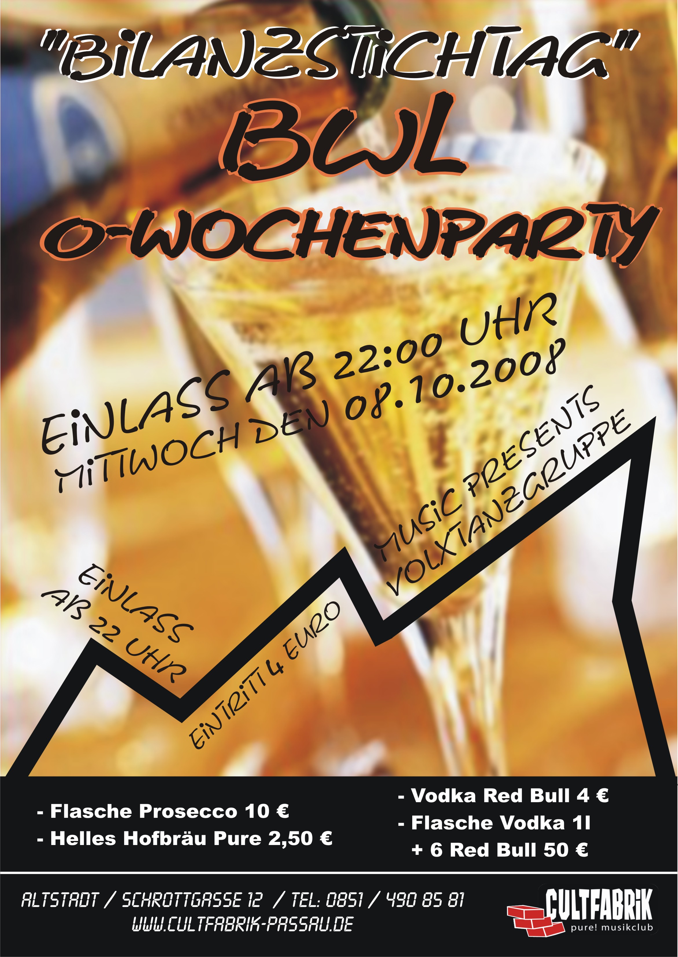 | 08. Oktober 2008 Cultfabrik in Passau BWL O-Wochenparty Start: 22.00 Eintritt: 4,00 Die ultimative Party mit natürlich der Volxstanzgruppe. Die präsentieren richtig heissen Funk und das ganze wird mit heissem Electronic-House von Dj Twill abgeschlossen. Nicht viel zu sagen, einfach ein Muss und volles Haus! Bis später in der Cultfabrik |