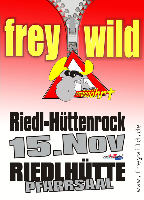 15. November 2008 Pfarrsaal Riedlhütte Am 15. November 2008 brennt die Riedl-Hütte! --> Riedl-Hüttenrock mit der beliebten Band Freywild. Die 6 Musiker werden den Pfarrsaal rocken! Los gehts um 20 Uhr. Einlass ab 16 Jahren! Also rein ins Auto und rauf aufd Hütten! |