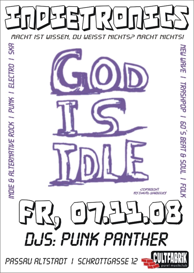 | 07. November 2008 Cultfabrik in Passau Indietronics@cultfabrik Start: 21.00 EIntritt: 3,00 bis 24 Uhr Bier für 1,00 Euro jeden Freitag Dj Punk Punther Indierock, Ska, Alternativ und Trash Pop Natürlich gibts auch wieder den unvergesslichen Luftgitarrenkontest: 1. Preis 1 Flasche Vodka 1l plus 6 Red Bull 2. Preis 1 Flasche Prosecco 3. Preis 1 Longdrink |