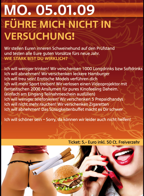 | Führe mich nicht in Versuchung! Wir stellen Euren inneren Schweinehund auf den Prüfstand und tesetn alle Eure guten Vorsätze fürs neue Jahr. Wie stark bist Du wirklich? Ich will weniger trinken! Wir verschenken 1.000 Long- bzw. Softdrinks. Ich will abnehmen! Wir verschenken leckere Hamburger. Ich will treu sein! Erotische Models verführen Dich. Ich will mehr Sport treiben! Wir verlosen einen Videoprojektor mit fantastischen 2000 Ansilumen für pures Kinofeeling daheim. Ich will weniger telefonieren! Wie verschenken 5 Prepaidhandys. Ich will nicht mehr rauchen! Wir verschenken Zigaretten. Ich will abnehmen! Das Süssigkeitenbuffet macht es Dir schwer. Ich will schöner sein - Sorry, da können wir Dir auch nicht helfen! |