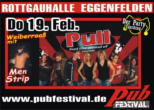 Am 19. Februar 2009 in der Rottgauhalle Eggenfelden Pub Festival - Weiberroas Natürlich feiert man die Weiberroas, Donnerstag den 19.02.09 wieder in Eggenfelden am Pub Festival. Neben guter Stimmung und der Band „PULL“ sind wieder einige Leckerbissen angesagt. Alle Frauen, die sich gern auch einmal ein paar leckere Kerle gönnen wollen, dürfen sich auf eine unvergessliche Men – Strip – Show freuen. |