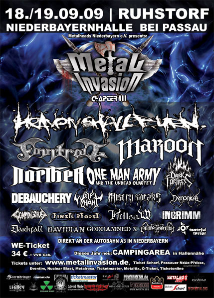 | 18.-19. September 2009 Niederbayernhalle in Ruhstorf Es wird wieder heiß im Herbst in Niederbayern! Das METAL INVASION Festival geht in seine dritte Runde und auch dieses Jahr wieder wie gehabt an 2 Tagen vom 18.-19.09.2009 Um auch beim Chapter III ein erneut schlagkräftiges Billing auffahren zu können, war ein Umzug ins benachbarte Ruhstorf (94099) an der A3 notwendig. Neues Veranstaltungsgelände wird hier der Bereich um die NIEDERBAYERNHALLE. Die mit dem Datum verbundene Änderung der Location geschieht auch nicht ohne Grund. Erstmals werden wir unseren Metalheads eine Camping-Area zur Verfügung stellen. Diese wird unmittelbar neben der Niederbayernhalle auf dem Gelände des Freibades sein. Parkplätze befinden sich ebenfalls unmittelbar vor der Halle. Des Weiteren befindet sich 5min entfernt im Zentrum ein Bahnhof, welcher es den Festivalbesuchern ermöglichen wird, nun auch problemlos mit der Bahn anzureisen. Infos zum Billing und aktuelle News rund um das Festival erhaltet ihr unter www.metalinvasion.de oder unter www.myspace.com/metal_invasion Tickets sind ab März bei eventim.de, Nuclear Blast, kartenhaus.de, Metalroxx. Ö-Tix, Ticket Scharf, metaltix.de und allen VVK-Stellen der Passauer Neuen Presse erhältlich. Running Order Freitag: 14:00 EINLASS 15:00 – 15:30 Anima Sementis 15:30 – 15:45 UMBAU 15:45 – 16:15 Goddamned X 16:15 – 16:30 UMBAU 16:30 – 17:00 Ingrimm 17:00 – 17:20 UMBAU 17:20 – 18:00 Demonical 18:00 – 18:20 UMBAU 18:20 – 19:00 Misery Speaks 19:00 – 19:20 UMBAU 19:20 – 20:00 Hellsaw 20:00 – 20:20 UMBAU 20:20 – 21:10 Norther 21:10 – 21:40 UMBAU 21:40 – 22:30 Maroon 22:30 – 23:00 UMBAU 23:00 – --:-- Finntroll ------------------------------------------------------ Running Order Samstag: 13:00 Einlass 14:00 – 14:30 Tasteful Terror 14:30 – 14:45 UMBAU 14:45 – 15:15 Darkfall 15:15 – 15:30 UMBAU 15:30 – 16:00 Davidian 16:00 – 16:15 UMBAU 16:15 – 16:55 Common Grave 16:55 – 17:10 UMBAU 17:10 – 17:50 Finsterforst 17:50 – 18:10 UMBAU 18:10 – 18:50 Wolfchant 18:50 – 19:10 UMBAU 19:10 – 19:50 Dark Fortress 19:50 – 20:20 UMBAU 20:20 – 21:10 Debauchery 21:10 – 21:40 UMBAU 21:40 – 22:30 One Man Army and the undead Quartet 22:30 – 23:00 UMBAU 23:00 – --:-- Heaven shall burn |