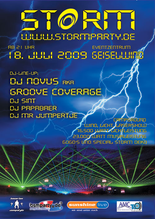 | 18. Juli 2009 Eventhalle in Geiselwind STORM @ Eventhalle Geiselwind Das Mega-event in der Eventhalle in Geiselwind! Mit DJ NOVUS aka GROOVE COVERAGE Dj Sint, Dj PapaBaer, Dj Mr Jumpertje, ... Fühle den Sturm mit Wind, Licht- und Lasershow, GoGo´s und einer wahnsinns Deko! Hotel und CampGround vorhanden! Infos unter : www.stormparty.de Kartenvorverkauf über HP und www.eventim.de |