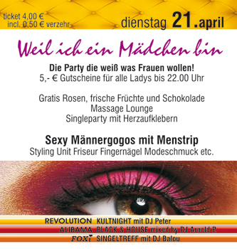 | Weil ich ein Mädchen bin @ Revolution Die Party die weiß was Frauen wollen! Specials: - 5,- € Gutscheine für alle Ladys bis 22.00 Uhr - Gratis Rosen, frische Früchte und Schokolade - Massage Lounge - Singleparty mit Herzaufklebern - Sexy Männergogos mit Menstrip Styling Unit Friseur Fingernägel Modeschmuck etc. |